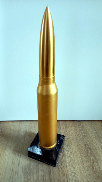 Biete Deko Hülse/Kartusche auf Steinsockel. Durchmesser der Hülse 55mm. Höhe gesamt 40cm. 2 kleine Dellen in der Hülse. Frei von Gefahrenstoffen. War ursprünglich aus Messing und wurde nachträglich veredelt. Die Spitze ist abschraubbar und wurde aus Metall hergestellt, kein Original. Reine Deko die sich als Sparbüchse oder ähnliches anbietet. Als Privatverkäufer schließe ich jegliche Gewährleistung aus!
