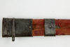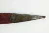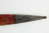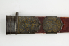 Kindjal, um 1800, Russland, Tula, Beingriff mit Waffelmuster, Stahlklinge mit Gold- und Silberauflagen, verziert mit klassichen Ornamenten, Holzscheide mit roten Samt bezogen, aufgelegte Beschläge in Gold und Silber, sehr selten, Trage- und Gebrauchsspuren. L: 54 cm. A Russian Hunting Kindjal, Tula Factory, about 1800, bone grip with steel mounts and inlaids in Gold and Silver, steel blade by Tula Factory, wooden scabbard with a suspension mount and finial, coated with red velvet, enchased with gold and silver foliate scrolls. L: 54 cm.