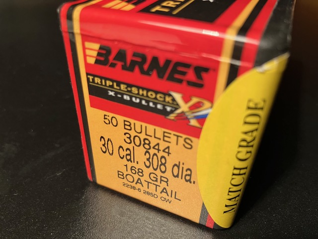 Angeboten werden 50 Geschosse Barnes Triple-Shock-X, .308, 168 gr Boattail - Match Grade Hunting Bullets in ungeöffneter Packung.