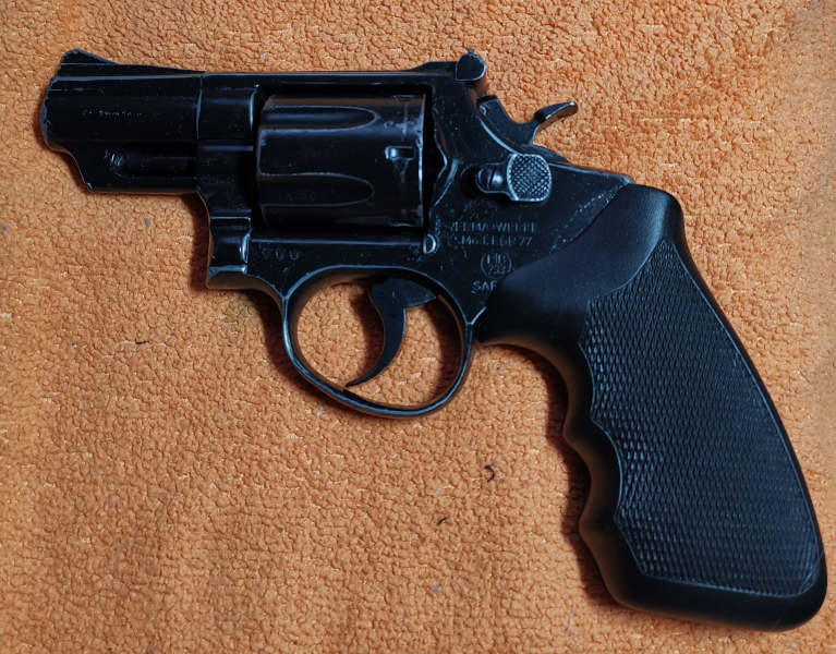 Relevante Teile wie Lauf, Trommel, Mechanik sind aus Stahl gefertigt und stehen für eine lange Lebensdauer die es bei den aktuellen Zinkdrucknachbauten nicht geben kann. Ein Trommelspalt, der nur im Gegenlicht sichtbar ist, sorgt in Verbindung mit einer minimalistischen Laufsperre und der nicht versetzten Trommel dafür, dass die volle Ladung mit gewaltigem „Rumms“ nach vorn den Lauf verlässt. Bitte auch bedenken: Ein Revolver kennt keine Ladehemmungen. Die gebrauchte Optik gibt ihm einen noch realistischeren Look. Die Waffe ist jetzt über 40 Jahre alt. Die Funktionen wurden mit abgeschlagenen Kartuschen getestet.