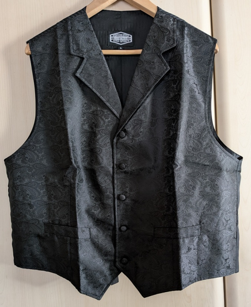 verkaufe: eine edle Old Style Weste - angegeben mit Größe XL (Maße: Gesamtlänge ca. 63 cm, einfache Breite über die Brust von Naht zu Nacht unter den Armauschnitten gemessen ca. 56 cm) - schwarz mit edlem Paisleymuster, stoffüberzogene Knöpfe, Verstellriegel am Rücken - neuwertig, nie getragen - vor Jahren gekauft, lag sie seit dem eingepackt im Schrank - wurde nur für die Fotos ausgepackt (Siehe Fotos!) - Neupreis ehemals 65 Euro