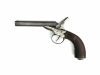 Derringer im Kaliber 6mm, 21 cm lang, Ganzstahl. Das Piston sitzt direkt hinter dem Lauf; deshalb und wegen des kleinen Kalibers handelt es sich möglicherweise um eine "Parlour Pistol". In diesem Fall wäre die Pistole für das Schießen ohne Schwarzpulver, nur mit Zündhütchen gedacht. Der Hahn lässt sich gegen den kräftigen Druck der Hauptfeder in beide Rasten legen.