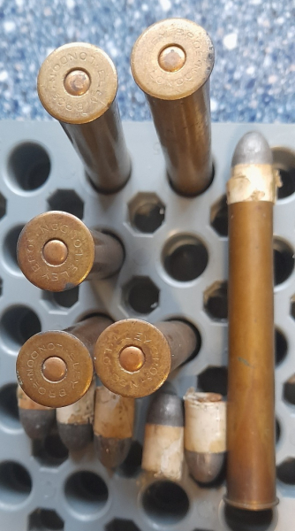 6 Stück gezünderte Hülsen von Eley, Kal. 450. Die Hülsenlänge ist 82 mm.