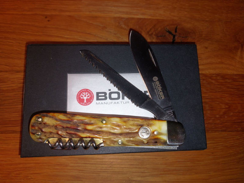Böker Klappmesser mit Hirschhorngriff Säge und Korkenzieher, 440C Stahl unbenutzt in original Verpackung, Made in Germany!