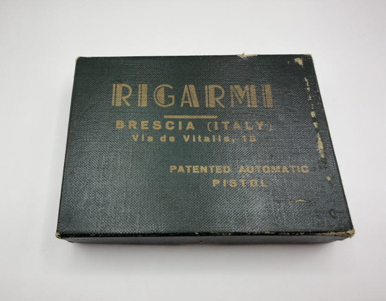 Der Karton eignet sich ideal als sammlerisches Zubehör, zur Vervollständigung einer Rigarmi-Pistole oder als eigenständiges historisches Original aus der italienischen Waffenindustrie.