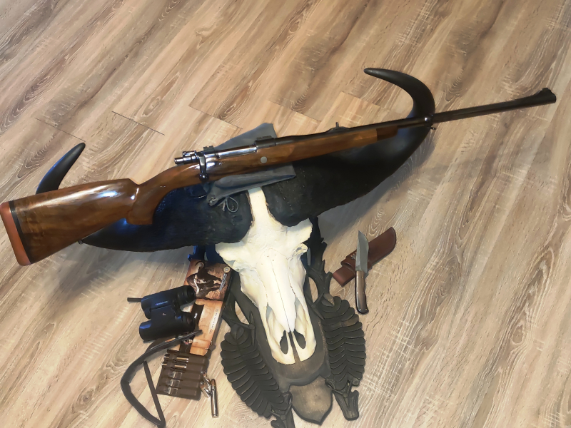 Waffe wurde in Deutschland zusammengestellt. Lange, robuste Schaft aus türkisch Nussbaum. Lauf und magazinboden graviert (Lauf mit: "Safariland .500 Jeffery" Magazinboden mit angreifender Elefant. Rote Gumischaftkappe, Kickstop eingebaut, Blaser Löwenkopf in Pistolengriffkapchen. Weaver Montagebasen. Verstellbare Abzug. 65 cm Lauf, 37 cm von Abzug bis Schaftende. Starke und robuste Safaribüchse, die elegant ist und für die wahre Einsatz gebaut wurde. Kaliber ist für die staerkstes und gefaerlichstes Wild geeignet. Wahre Lebensversicherung des Grosswildjagers.