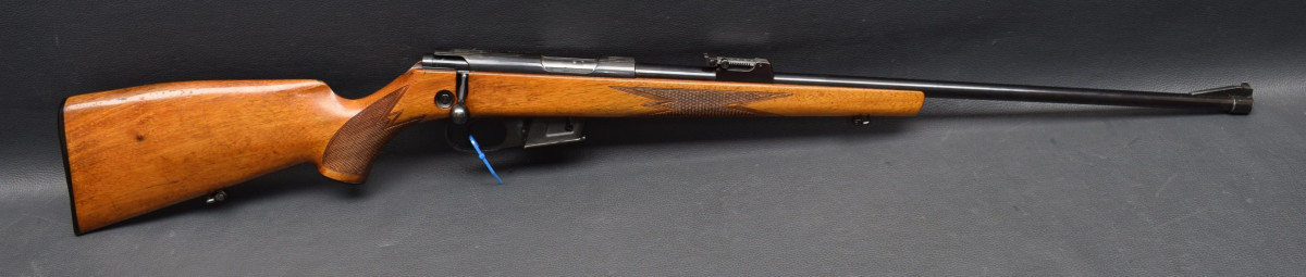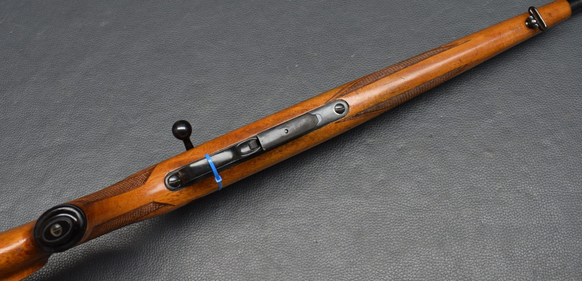 LAuf ohne Visierung, 11 mm Schiene für Zielfernrohr, Stecher, Druckknopfsicherung, 5 Schuss Magazin. Nußbaumschaft mit Backe,Schaftkappe und Riemenbügeln. Lauf sehr gut, Brünierung 96%, Schaft gut Gebrauchtwaffe gut