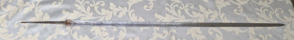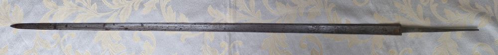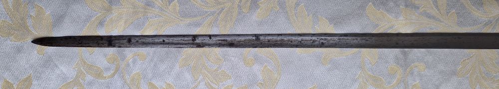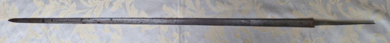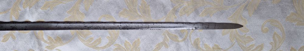 Gesamtlänge mit Angel 101,3 cm. Angellänge 16,3 cm. Klingenlänge 85,1 cm. Klingenbreite am Ansatz 2,6 cm.