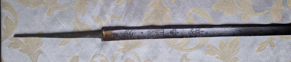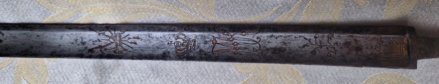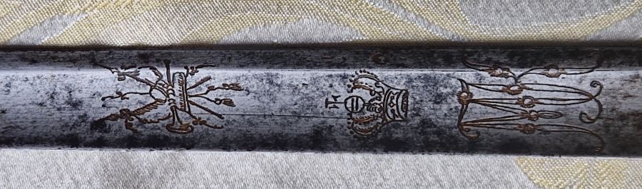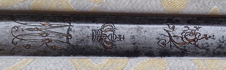 Lange Degenklinge, beidseitig verziert und vergoldet. MJK unter Krone sowie Zierrat. Ansatz vergoldet.