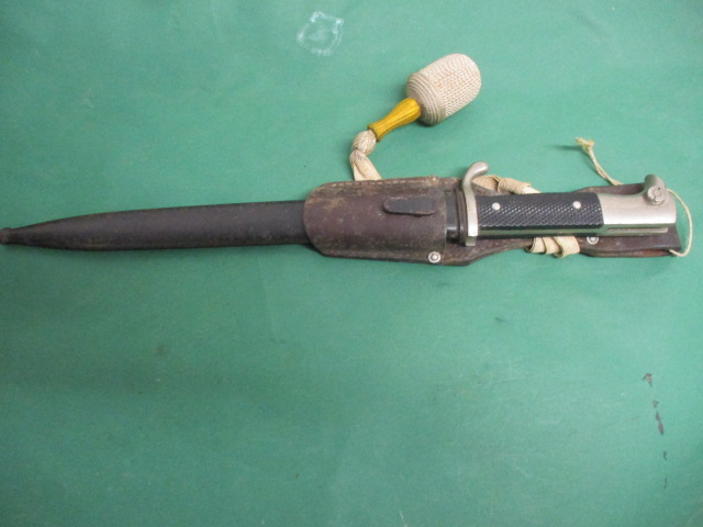 Angeboten wird ein Ausgehbajonett 98 k der Wehrmacht incl. Troddel und originaler Tasche . Klinge blank ,kleine Beschädigung and der Schale und ein Paar keine Pits am Griff und Scheide . S. Bilder .Kein Herstellerstempel.