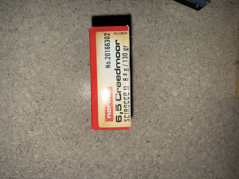 Eine vollständige Schachtel Norma Scirocco 130 grain im Kaliber 6,5 Creedmoor, Schachtel wurde einmal geöffnet