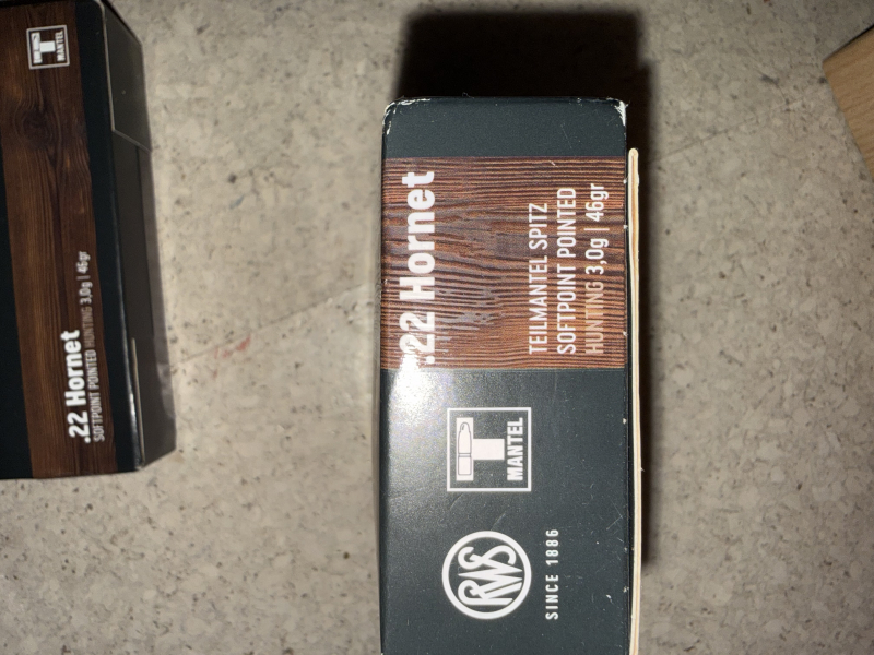 zwei Schachteln RWS TMS 46gr im Kaliber .22 Hornet eine Schachtel ist ungeöffnet aus einer fehlen 7 Schuss
