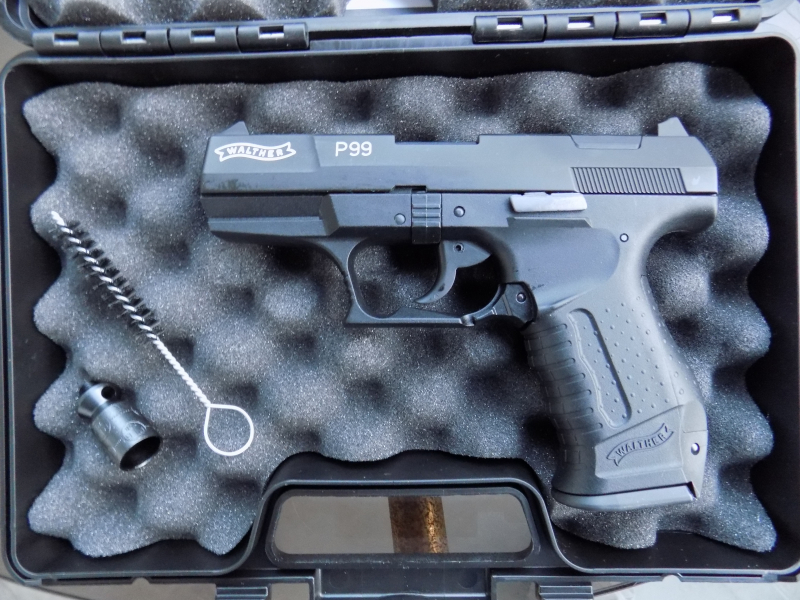 Ich muß verrückt sein, mir eine Luger 08 zuzulegen, die aufgrund ihrer "antiken" Kniegelenkmechanik mir ein wesentlich "gemächlicheres Abfeuern" abverlangen wird am nächsten Silvesterabend?! Ganz anders verhält es sich mit diesem guten Stück einer "Walther P99", Kal. 9mm P.A.K. : die ist dagegen eine wahre "Schnellfeuerwaffe" (natürlich Einzelfeuer!), wo man aufpassen muß, nicht gleich eine ganze Schachtel innerhalb weniger Minuten abzufeuern! Es macht sehr viel Spaß, damit zu schiessen! Das hier angebotene Stück wurde von mir am 26.11.25 erst neu angeschafft und mit gerade mal 15 Schuss eingeballert, sozusagen! Mitgeliefert werden die originale Aufbewahrungsbox, Putzbürste, Zusatzlauf für Signalsterne, Gebrauchsanleitung und nicht zuletzt die Rechnung mit Reparatur/Retoureschein, den Sie aber nicht brauchen werden: habe die Walther zerlegt, gereinigt und neu eingeölt! Die Waffe ist also so gut wie neu! Gehäuse aus Polymere, Verschlussteil aus Metall! Gesamtgewicht: 660g, Magazinkapazität: 15 Schuss! Da es sich hierbei aber um einen privaten Weiterverkauf handelt, kann ich keine Rücknahme oder sonstige Gewährleistungen anbieten!