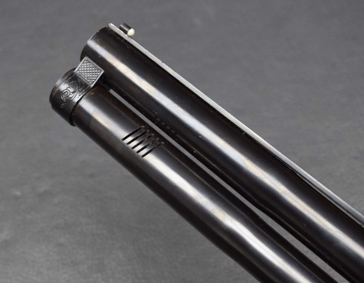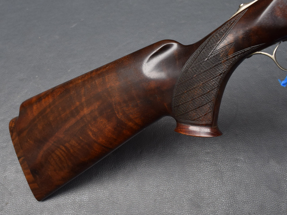 Läufe sehr gut, Brünierung 98%, Schaft gut, mit Pistolengriffkäppchen und Monogramplatte,