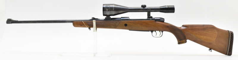 Jagdrepetierer mit deutschem Stecherabzug, seitlicher Sicherung und Klappdeckelmagazin für 4 Patronen. Der Lauf ist blank, die Brünierung stark berieben. Montiert mittels einer SEM ist ein Kahles Zielfernrohr Helia Super 8x56. Die Durchsicht des Glases ist leicht gelblich. Schaftlänge 38cm ( gemessen vorderer Abzug bis Mitte Schaftkappe)