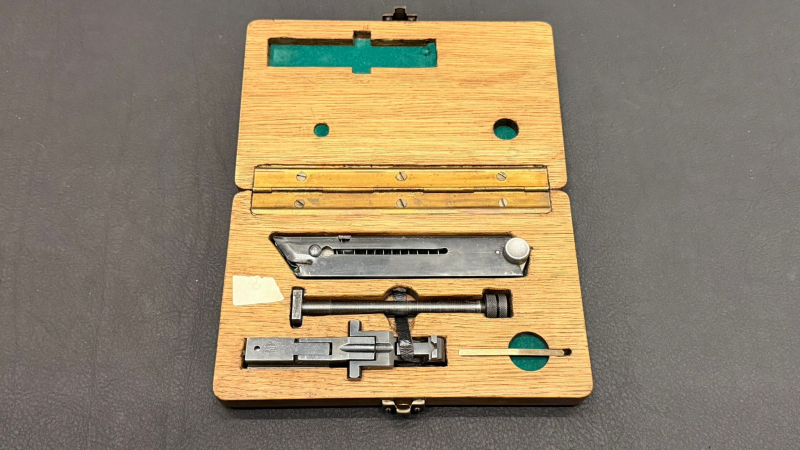 Angeboten wird ein originales Erma Wechselsystem (Einstecksystem) für die Pistole P08 im Kaliber .22 l.r.. Das Set stammt aus deutscher Fertigung und wird im originalen Holzkasten geliefert.