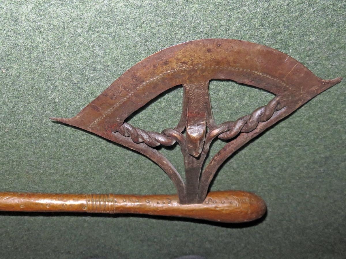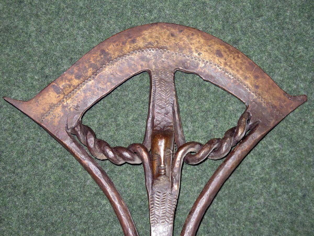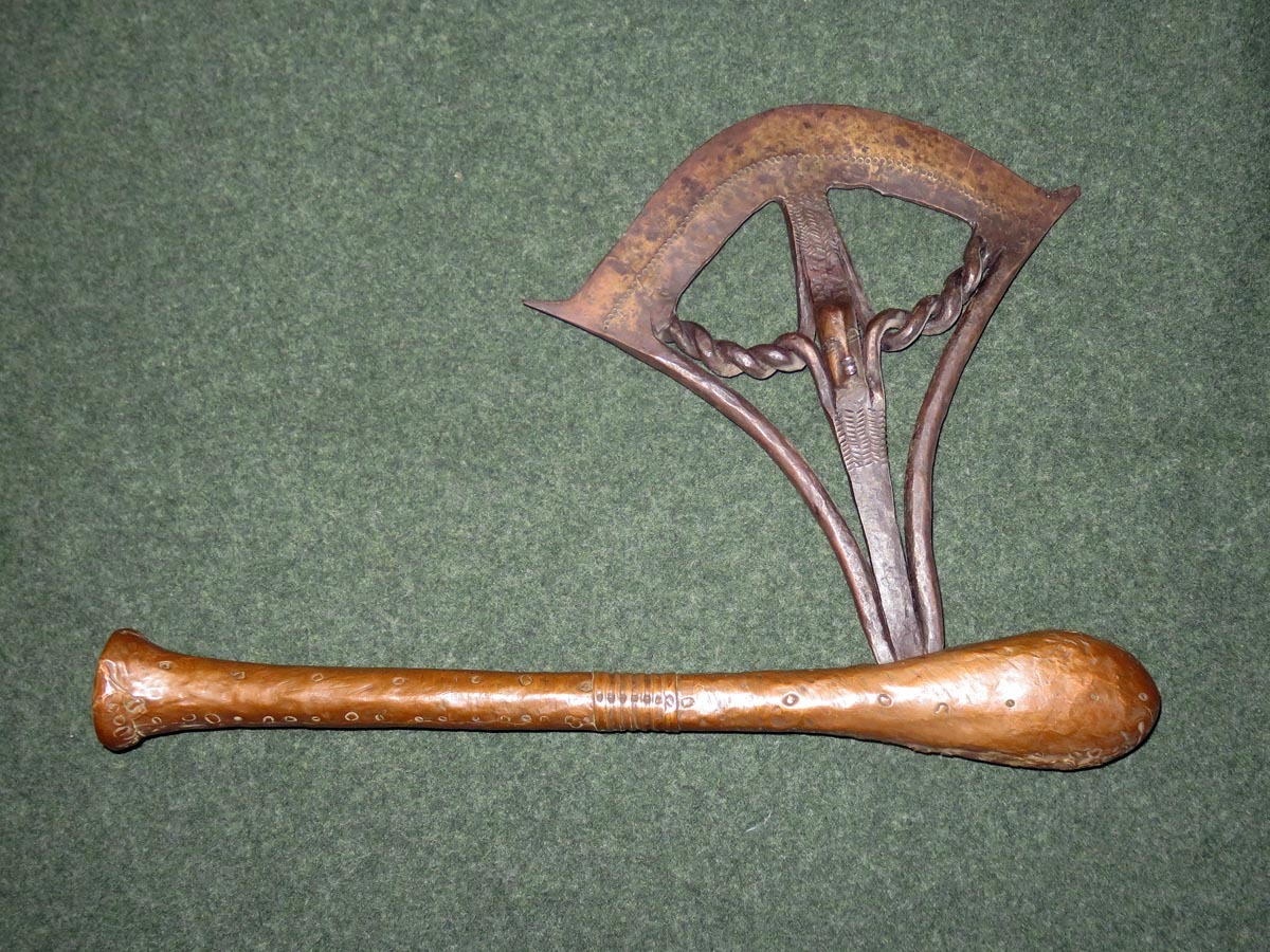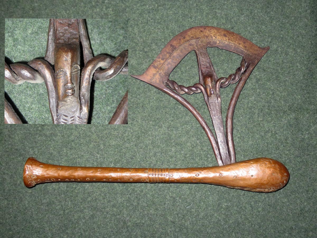 Das Beil ist eine aus Schmiedeeisen hervorragende Arbeit afrikanischer Handwerkskunst mit einem beschlagenen Griff aus verziertem Kupferblech.