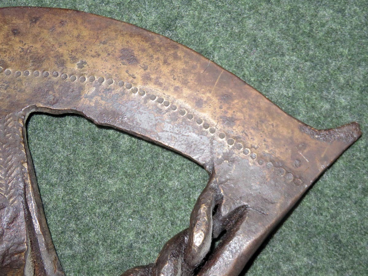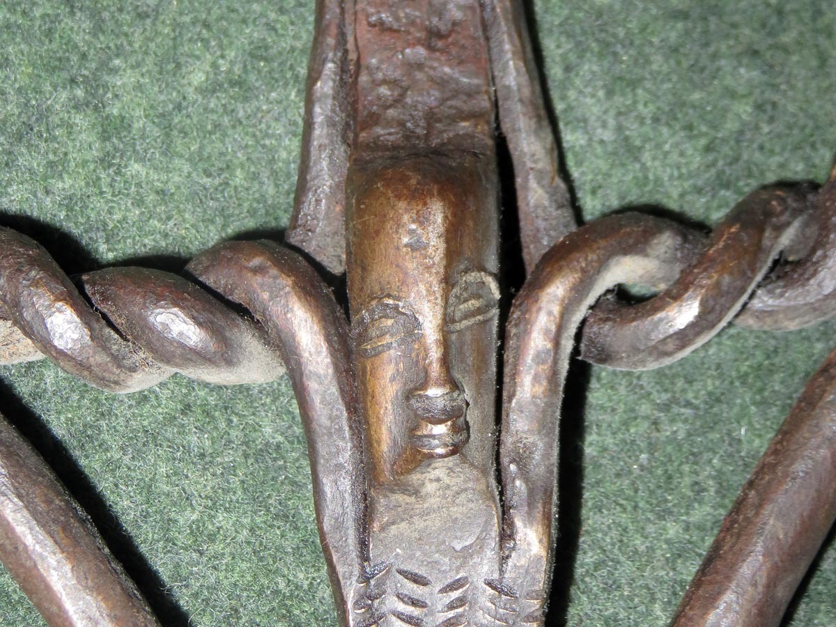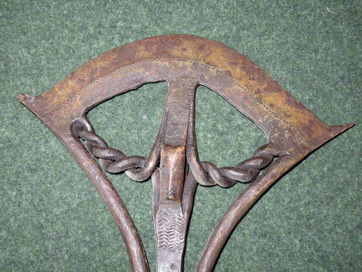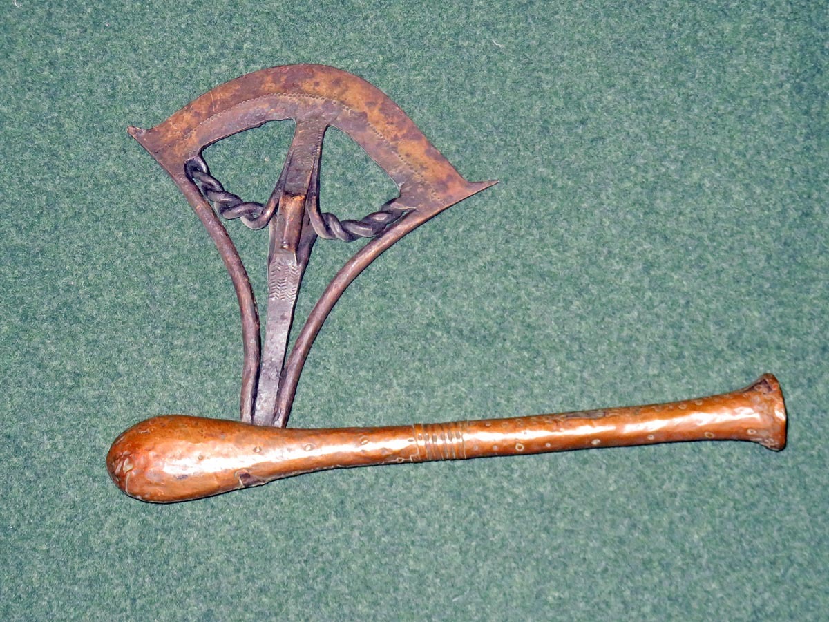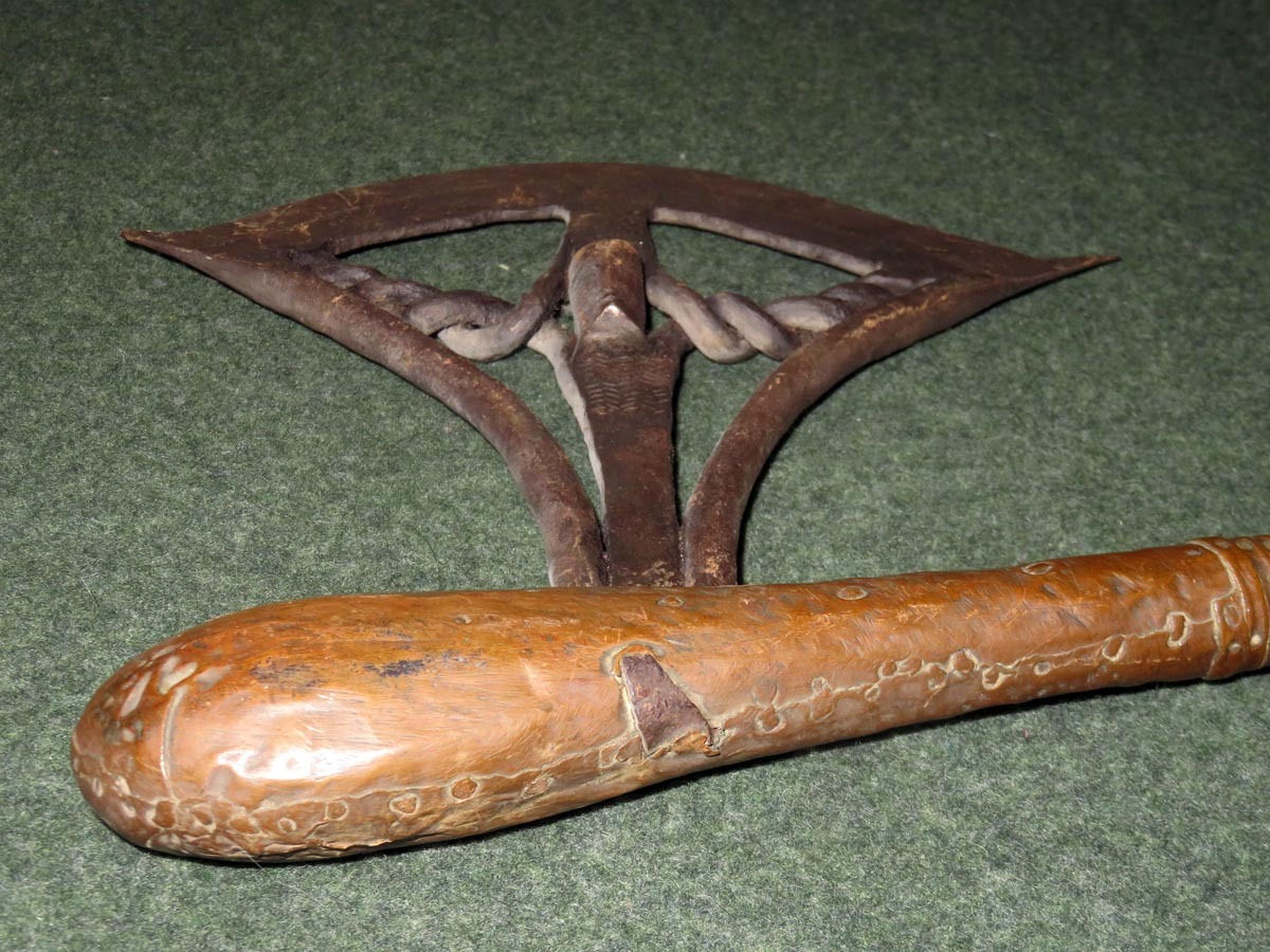 Das Beil ist eine aus Schmiedeeisen hervorragende Arbeit afrikanischer Handwerkskunst mit einem beschlagenen Griff aus verziertem Kupferblech.