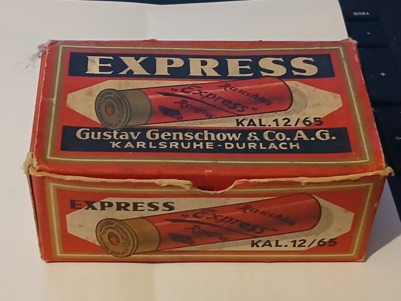 Bitte mygun beachten!!! Aus Nachlass eines verstorbenen Jägers: Historische LEERE Schrotpatronenschachtel der Marke Gustav Genschow Express im Kaliber 12/65.