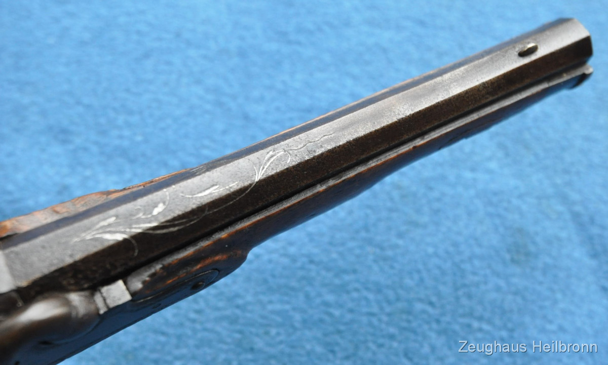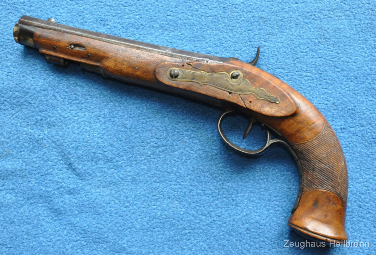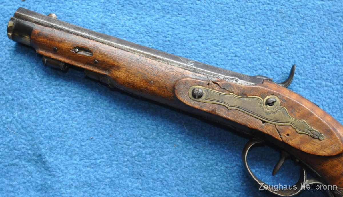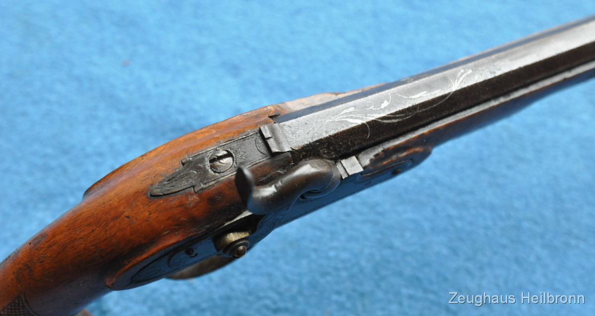 Gebraucht, siehe Bilder, Lauf glatt, innen gut erhalten. Hahn kann gespannt und abgeschlagen werden. Holz mit Riß, aber fest. Keinerlei Stempelung.