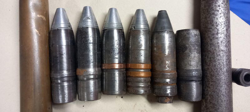Six projectiles allemands de la Seconde Guerre mondiale inertes et présents en modèles différents.