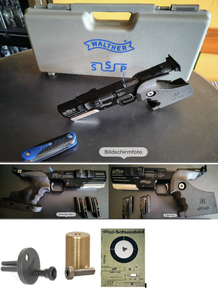 Artikelbeschreibung: Verkaufe Walther SSP (Beschuss: BG), Griff M rechts, neue Ausführung mit der Möglichkeit rechts und links der Mündung Gewichte zu befestigen. Die Lauflänge beträgt 150mm. Ich bin Erstbesitzer. Auf der Handballenauflage wurde ein Grip Tape aufgebracht. Ein Linbrunner Züngel wurde eingeklebt, da ich kurze Finger habe und mit dem Original Züngel nicht zurecht kam. Ggfs müsste ein neues Züngel und Züngelträger angeschafft werden. Die Kosten liegen bei ca. 23 Euro (Fa. Birratz)... Bereits proph. getauscht wurden die Schlagfeder- und Verschlussfederstange nebst passender Feder und der Anschlagspuffer. Was ist dabei: 1 x Walther SSP cal. 22lr. 1 x Original-Walther SSP Koffer, 2 x SSP Magazine, 1 x blaues Pufferfähnchen, 1 x Zerlegewerkzeug, 1 x Original blaue Imbusschlüsselwerkzeug, 1 x Walther-Mündungsgewicht, 1 x Extra-Walther-Griffgewicht, 1 x Original-Bedienungsanleitungen, 1 x Original Beschussbild (10 Schuss auf 25m).