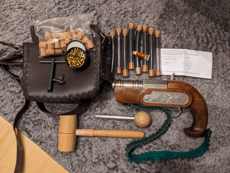 Zusätzlich dabei ist Hammer, Ladestock, Piston Schlüssel, Schusstasche Schillinger aus Leder, 8 Pulverröhrchen, eine Fast volle Dose Zündhütchen und eine angebrochene Tüte Korken, siehe Fotos.