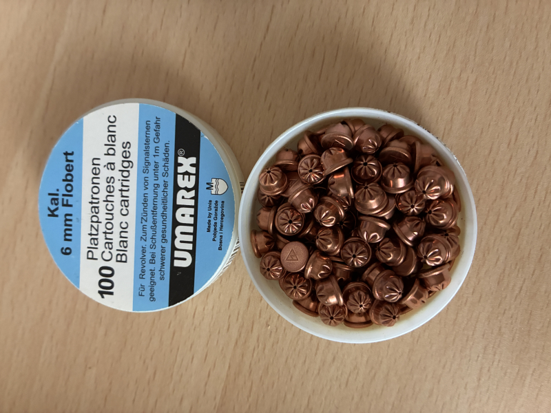 Sie kaufen hier eine bereits geöffnete und angefangene Dose Platzpatronen. Kal. 6mm Flobert von Umarex.