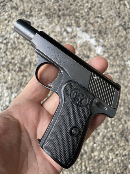 Walther Pistole Mod. 7; 3.Variante mit feinen Spannrillen sowie Kimme und Spitzkorn.Beschriftung linke Schlittenseite in kursiv: WALTHER´S PATENT CAL. 6,35 und darunterliegend Walther Schleife Beschriftung rechte Schlittenseite: WAFFENFABRIK WALTHER ZELLA - MEHLIS darunterliegend Beschuss Krone über NGriffstück rechte Seite vor dem Abzugsbügel Beschuss Krone über N.Griffstück linke Seite vor dem Abzugsbügel S.Nr. 68705.Schwarze Kunststoffgriffschalen mit Fischhaut und CW Logo im Oval.Magazinboden mit Markierung Walther in Vertiefung.