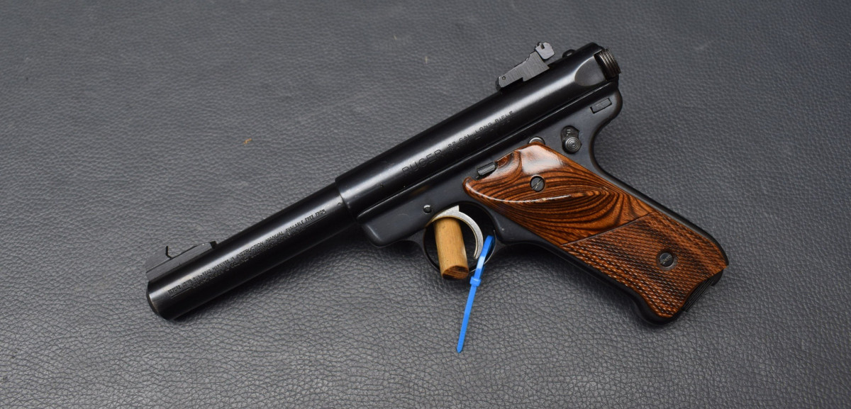Holzgriffschalen mit Daumenauflage und Ruger Logo.