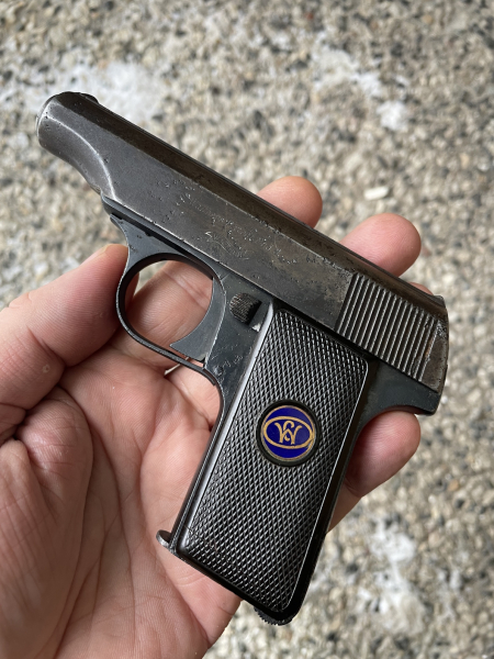 Walther Mod. 8 Kaliber 6,35mm, Dachbodenfund, Waffe befindet sich im Fundzustand. Sie löst nicht immer zuverlässig aus, ist aber komplett. Lässt sich also verbessern. Beschuss Krone N, siehe Bilder
