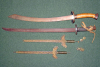 Die Säbel/Schwerter sind mit einfachen Eisentellern sowie Holzgriffe, wobei der eine mit Bast umwickelt ist.