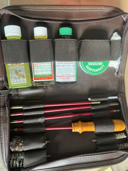 Waffenpflege Set. für zu Hause oder zur Jagdreise,immer alles dabei ob Kugel jedes Kaliber oder Schrot, Öl, Fett, Schaftpflege, nie benutzt.