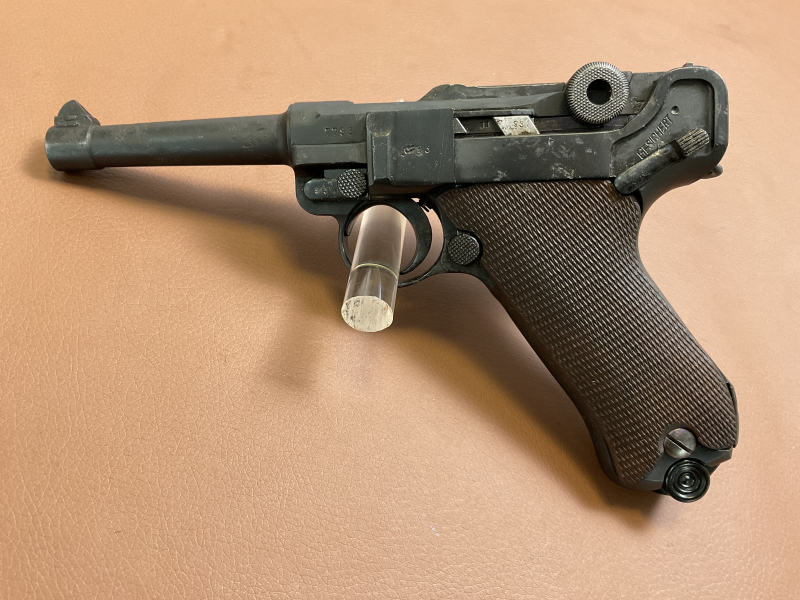 Zum Verkauf steht eine restaurierte Pistole 08 von Mauser, gefertigt 1936 (Code S/42). Die Waffe wurde neu brüniert. Griffschalen und Magazin sind Nachkriegsfertigungen. Am Lauf sind deutliche Rostnarben vorhanden, der Lauf ist stellenweise rau, Züge und Felder sind jedoch gut erhalten.