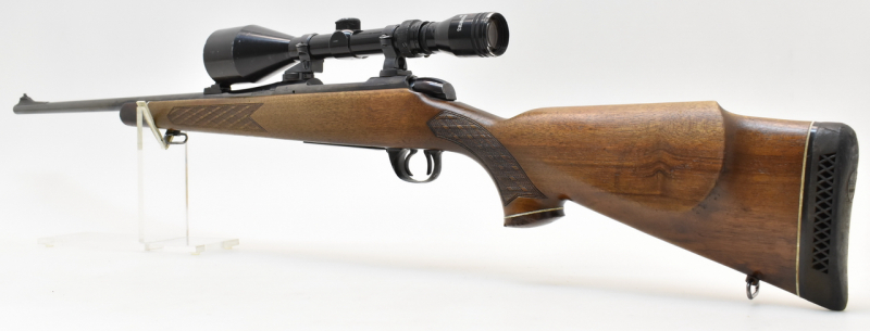 Jagdrepetierer mit spiegelblankem Lauf und Stecherabzug. Das vordere Züngel wird zum Einstechen nach vorn gedrückt. Dunkles Schaftholz mit Backe und Pistolengriff, Schaftlänge gemessen von vorderen Abzug bis Mitte Schaftkappe 38cm. Fühl-und sichtbarer Signalstift oben am Schloss zur "gespannt" Anzeige. Montiert ist ein Tasco 3-12x56 Abs. 1 mittels einer Kontra Einhakmontage.