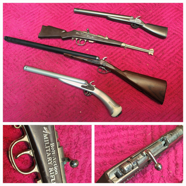 Konvolut --- Gewehr Feuerzeug --- 4 Stück. Das Längste ist fast 39cm lang. Für Sammler von Seltenheiten :). Allerdings lagen die 4 Feuerzeuge nur im Schrank. Vermutlich ohne Funktion. Darum Verkauf als Defekt an Bastler. Auslandsversand muß erfragt werden. Mein Versand gilt nur für Deutschland mit 8,- EUR. Viel Spass beim bieten.