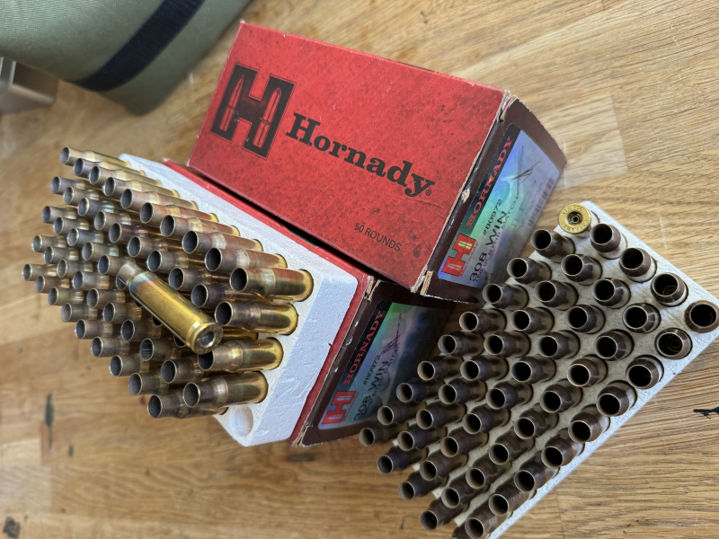 100 Hornady Hülsen im Kaliber .308 Win, abgefeuert, entzündert und grob gereinigt aus einem Los