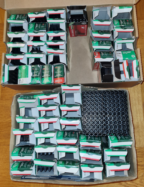 Gebrauchte, noch gut verwendbare Patronenschachteln für bis zu 2.900 wiedergeladene 9mm Patronen.