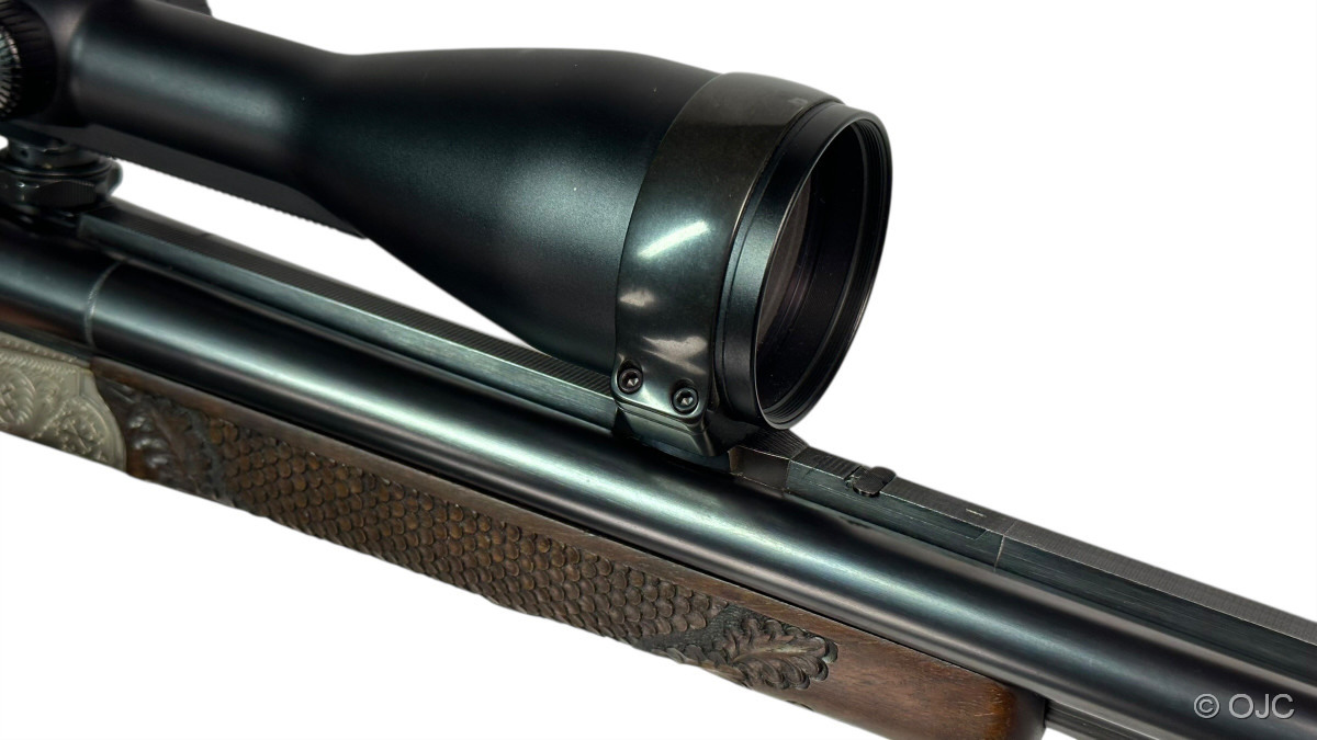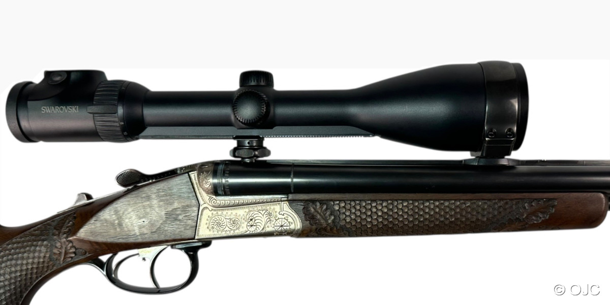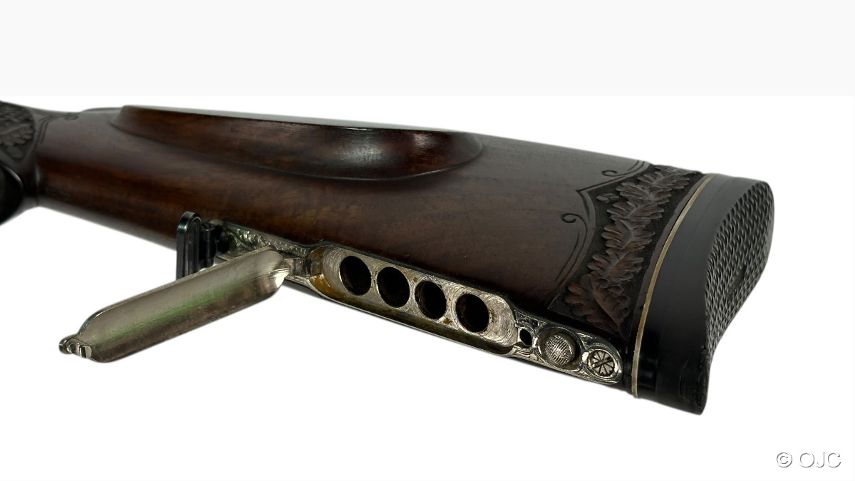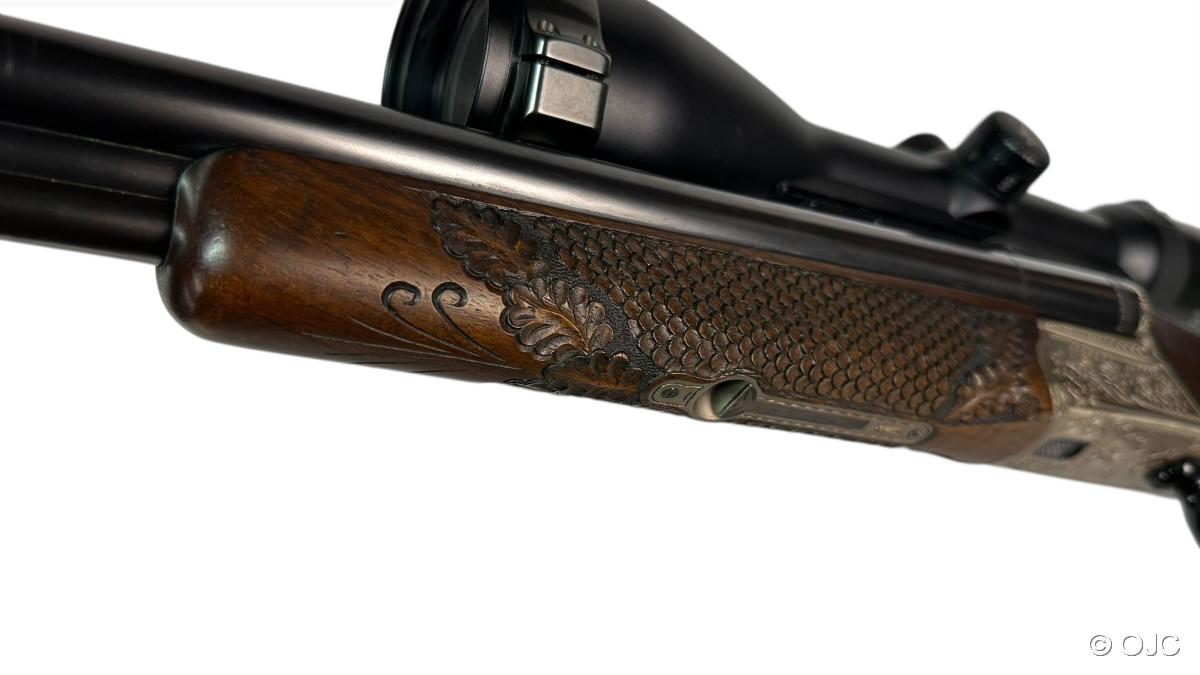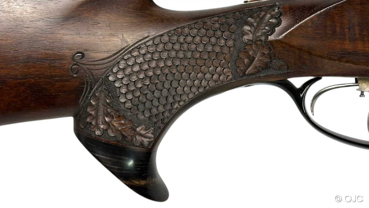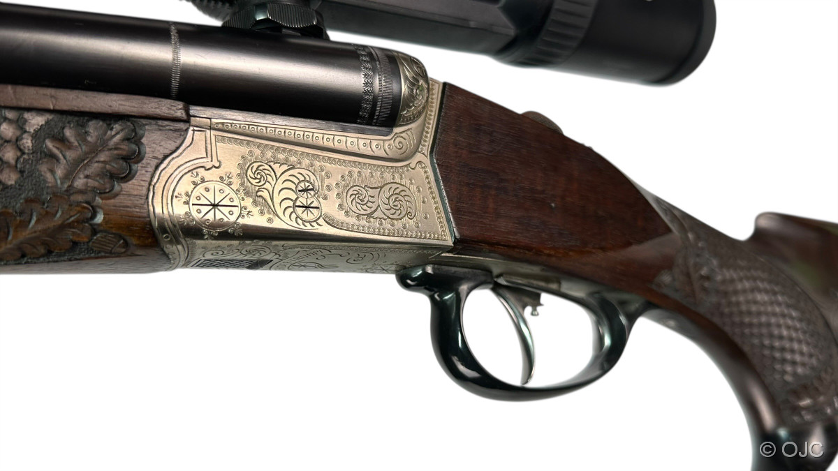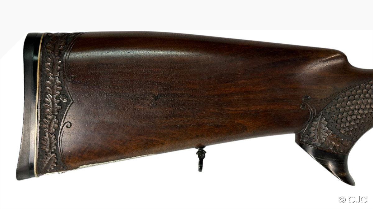 Hier bieten wir einen mit wunderschönen Schaftverschneidungen und Schuppenfischhaut versehenen, originalen Krieghoff Trumpf Drilling an. Nicht nur der Schaft, auch die feinen, aber doch dezenten Gravuren der Basküle sowie das Schaftmagazin verleihen der Waffe eine entsprechende Eleganz.