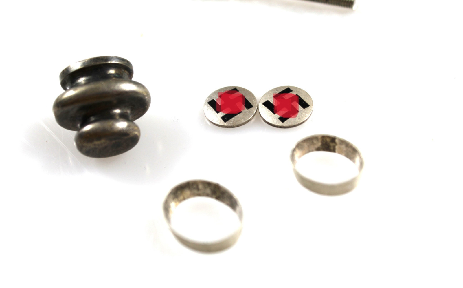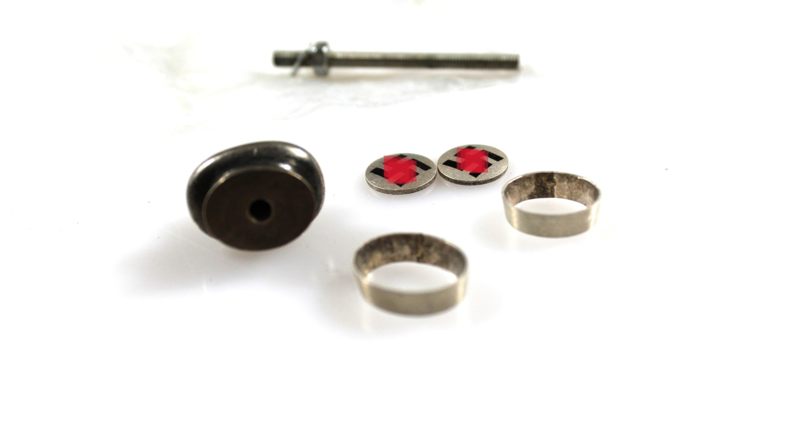 Griffteile für DLV Pilotenmesser, Kopfschraube, Griffendkappen und Griffembleme.