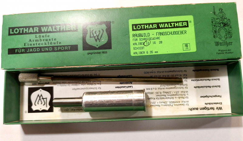 Zum Verkauf kommt ein Lothar Walther Fangschußgeber für Flinten im Kaliber 12. Das Gerät kann mit einer Patrone 6,35 fertig geladen in der Tasche getragen und im Fall der Fälle schnellstens für den Fangschuß zum Einsatz kommen.