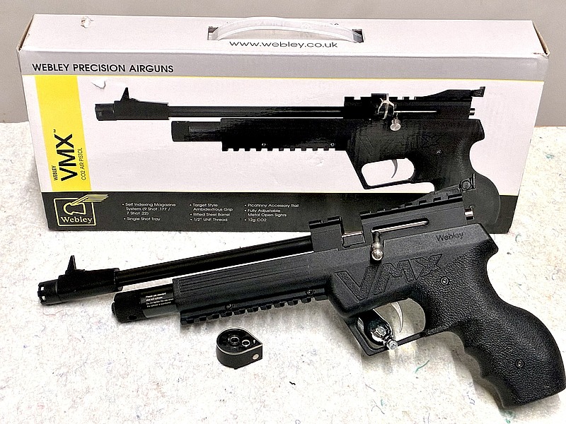 Die Webley VMX ist eine sehr präzise Freizeitpistole mit einem gewissen „tactical touch“ und einem handlichen, ergonomischen Griff. Das Korn ist fest, die Kimme ist in der Höhe und seitlich einstellbar. Schraubt man die Kimme ab, kann man auf der Weaver/Picatinny-Schiene eine Zieloptik anbringen. Eine weitere (untere) Weaver/Picatinny-Schiene befindet sich vor dem Abzugsbügel. Der Druckpunkt-Abzug ist einstellbar, was allerdings recht umständlich ist.