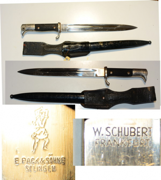 Deutsches Ausgehseitengewehr 2. Weltkrieg mit Koppelschuh, Hersteller "E. Pack & Söhne Solingen", andere Seite " W. Schubert Frankfurt", der Lack der Scheide teils abgeplatzt, Lack des Koppelschuhs mit Kratzern, ansonsten guter Zustand