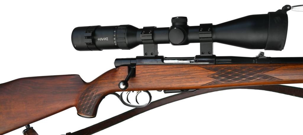 Rundum gut erhaltene Repetierbüchse, Stutzen, Schonzeit-Jagdgewehr mit Stecher, Flügelsicherung und Zielfernrohr HAWKE LR DO6 2,5-10fach auf Prismenschiene; 8fach dimmbarer Leuchtpunkt, mit frisch erneuerter Batterie: