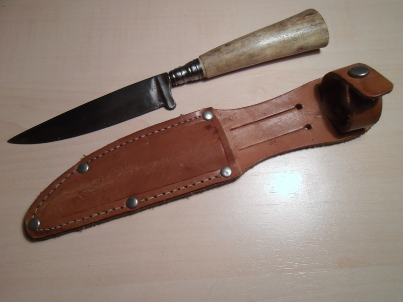Jagdmesser, Brotzeitmesser, Trachtenmesser mit Horngriff, benutzter Stahlklinge, mittelbrauner Lederscheide, Gesamtlänge 21 cm. Die dazugehörige mittelbraune Messerscheide ist mit einem praktischen Gürtelschlitz ausgestattet, sodass das Messer stets griffbereit und sicher verstaut ist. Altersnachweis erforderlich.