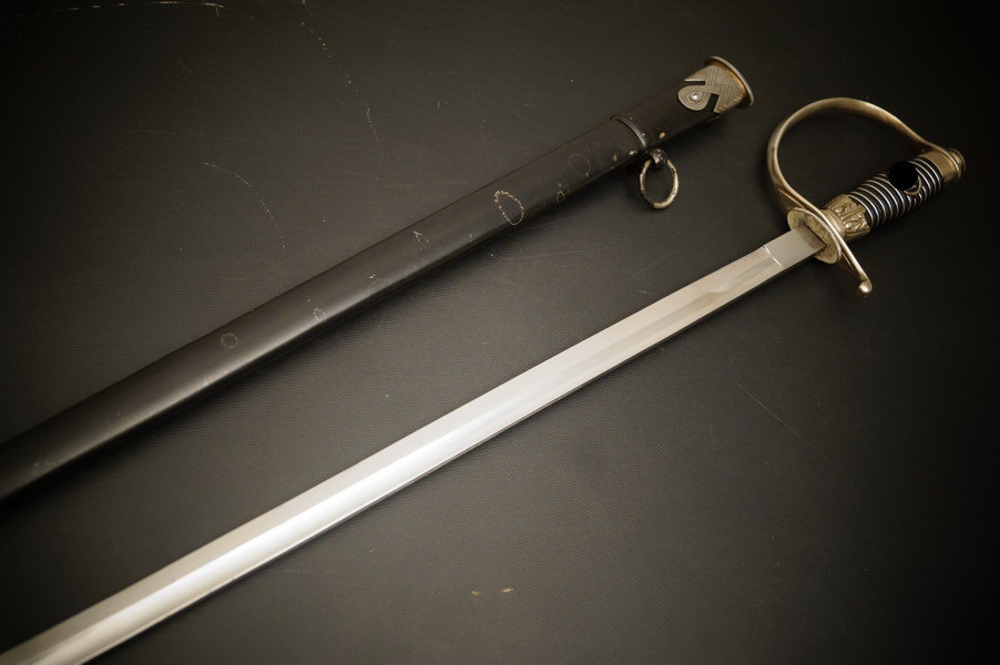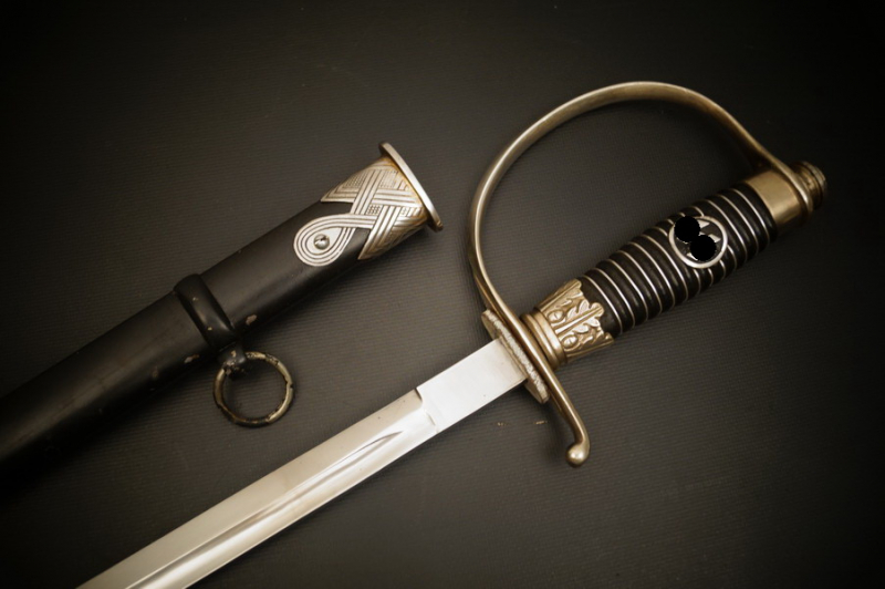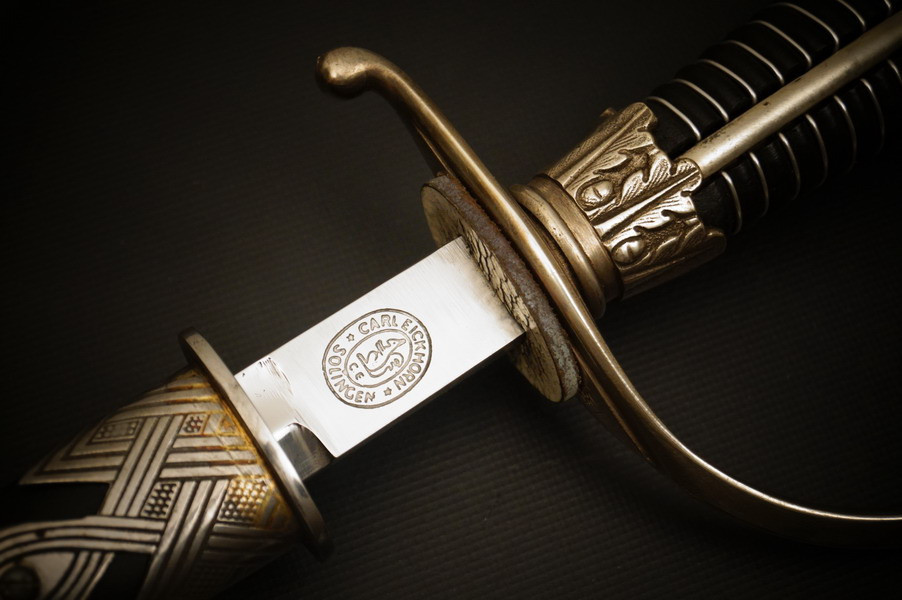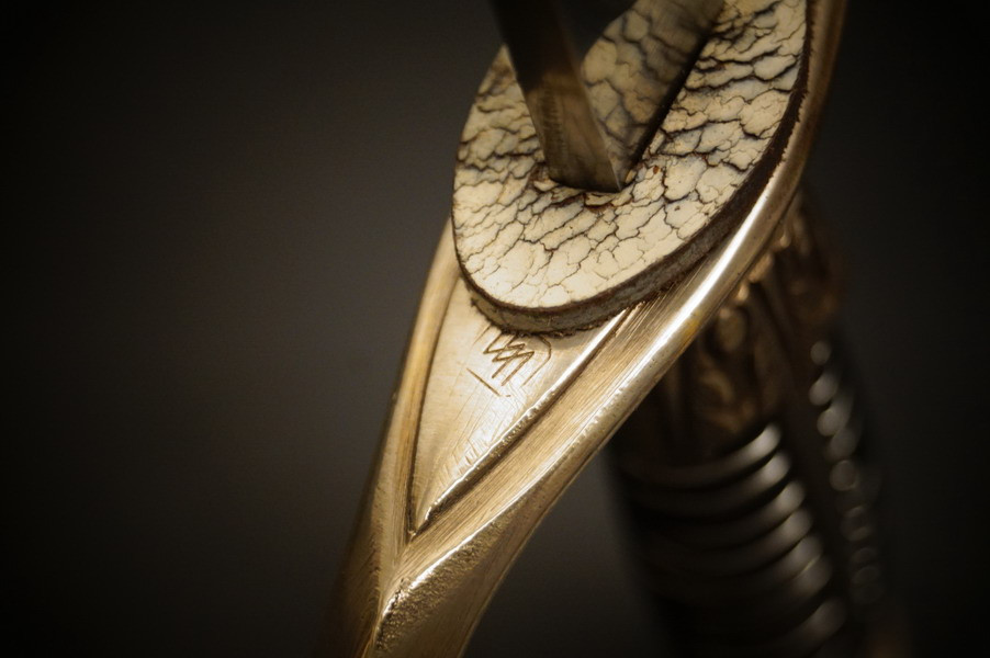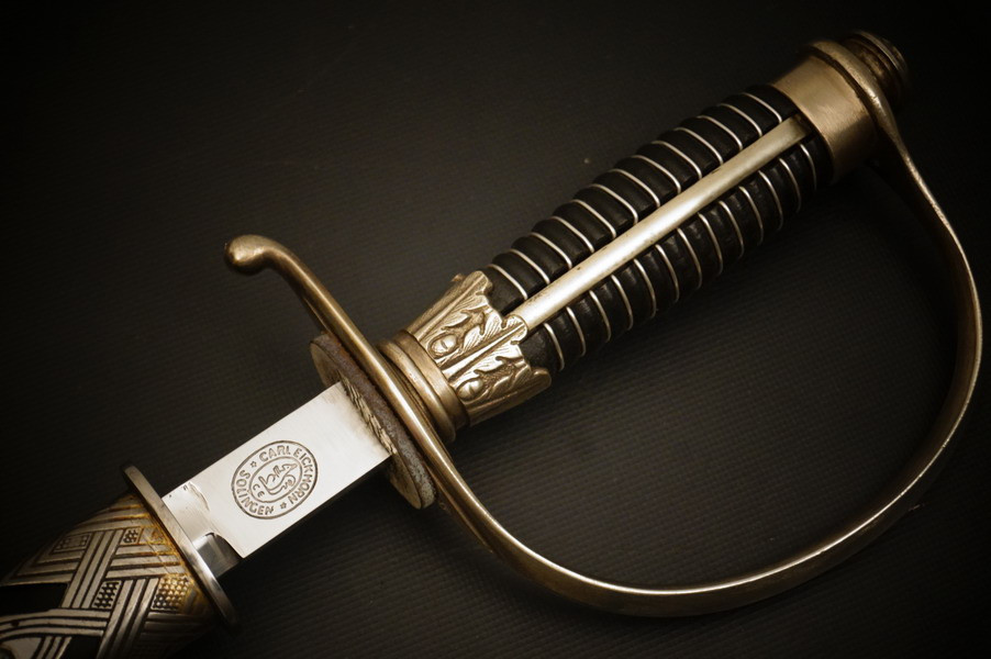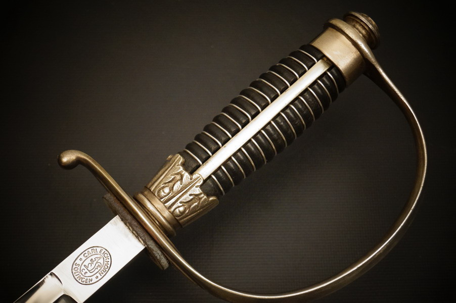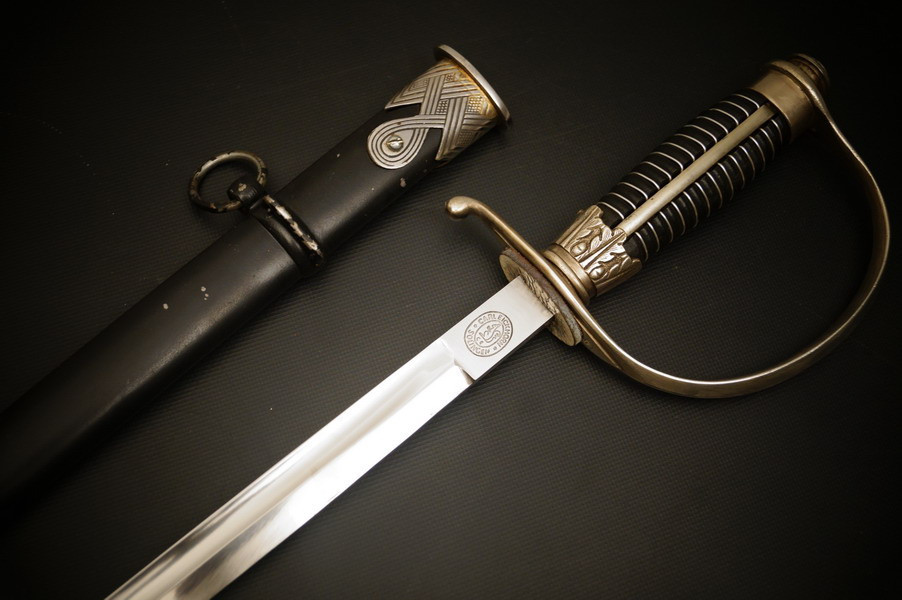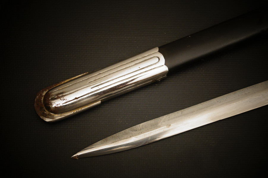 Fundzustand. Stahlscheide, oberer Scheidenbeschlag mit identischer Abnahme wie auch im Gefäß. Stahlklinge mit Hersteller. Gefäß aus Neusilber, Stahlkopfschraube versilbert. Holzgriff mit Medaillion, keine Holzausbrüche und der Aludraht ohne Riss.