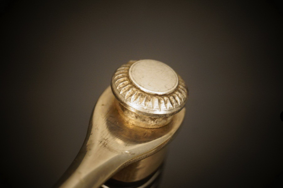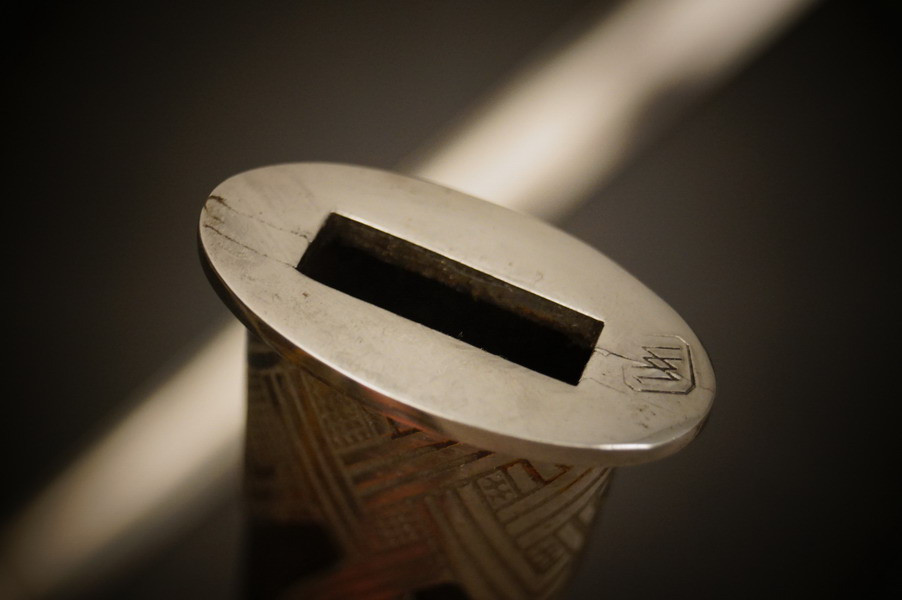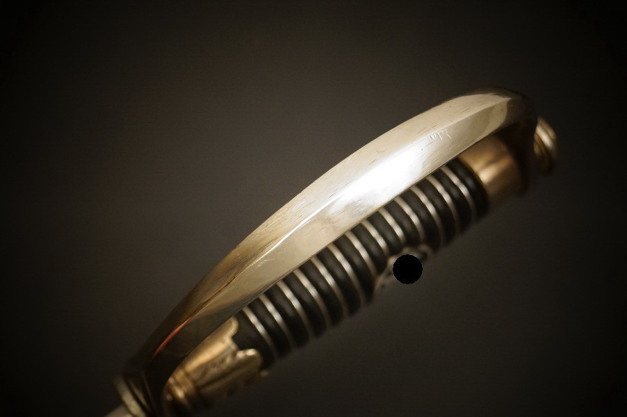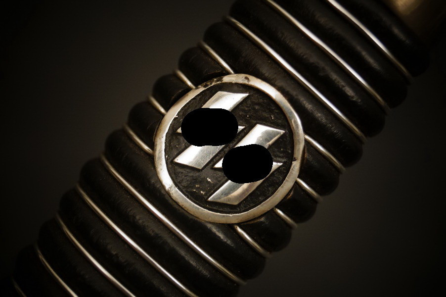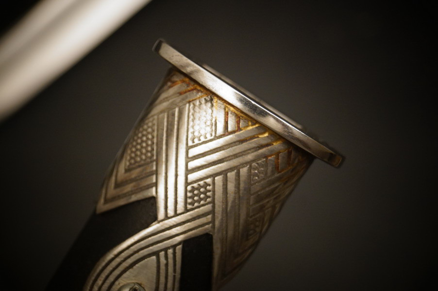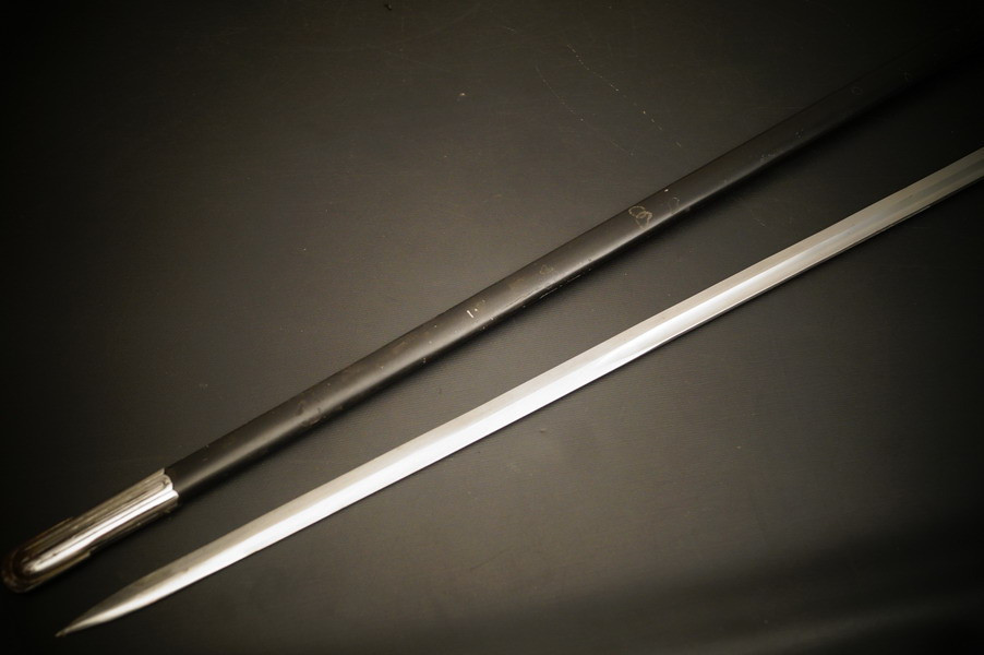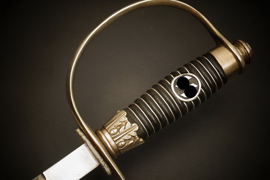 Fundzustand. Stahlscheide, oberer Scheidenbeschlag mit identischer Abnahme wie auch im Gefäß. Stahlklinge mit Hersteller. Gefäß aus Neusilber, Stahlkopfschraube versilbert. Holzgriff mit Medaillion, keine Holzausbrüche und der Aludraht ohne Riss.