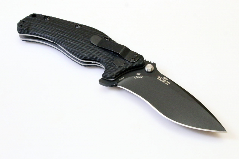 Drop-Point Klinge mit DLC-Beschichtung. Terzseitig bezeichnet "0200" über "KAI Patented", über "Made in USA". Zudem bezeichnet "0364" über "154CM" (Klingenmaterial), datiert "FEB 07". Quartseitig Firmenlogo des Herstellers. Die Klinge versehen mit beidseitigen Daumenpins. Der Ansatz des Klingenrückens versehen mit einer geriffelten Daumenauflage.