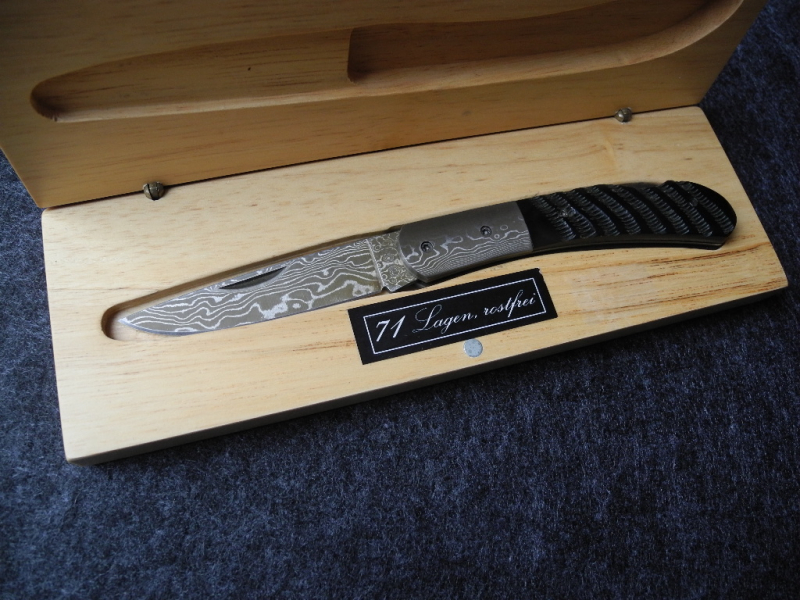 Sehr schönes Backlock Taschenmesser aus 71 Lagen Damast und schwarzem Horngriff, Holzbox und Papierschuber, Gesamtlänge 17,5 cm, Klinge 7,5 cm, unbenutzt, aus Sammlung, Versand im Hermes S-Paket oder auch wahlweise per DHL.