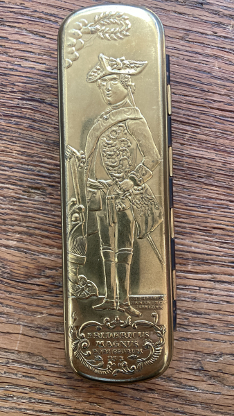 Hier kommt zur Versteigerung eine wunderschöne und sehr gut erhaltene Schatulle ( Innen wie Außen ), Tabakdose aus Messing und Kupfer. Sie hat edle Prägungen mit einigen Inschriften und Monogramm.